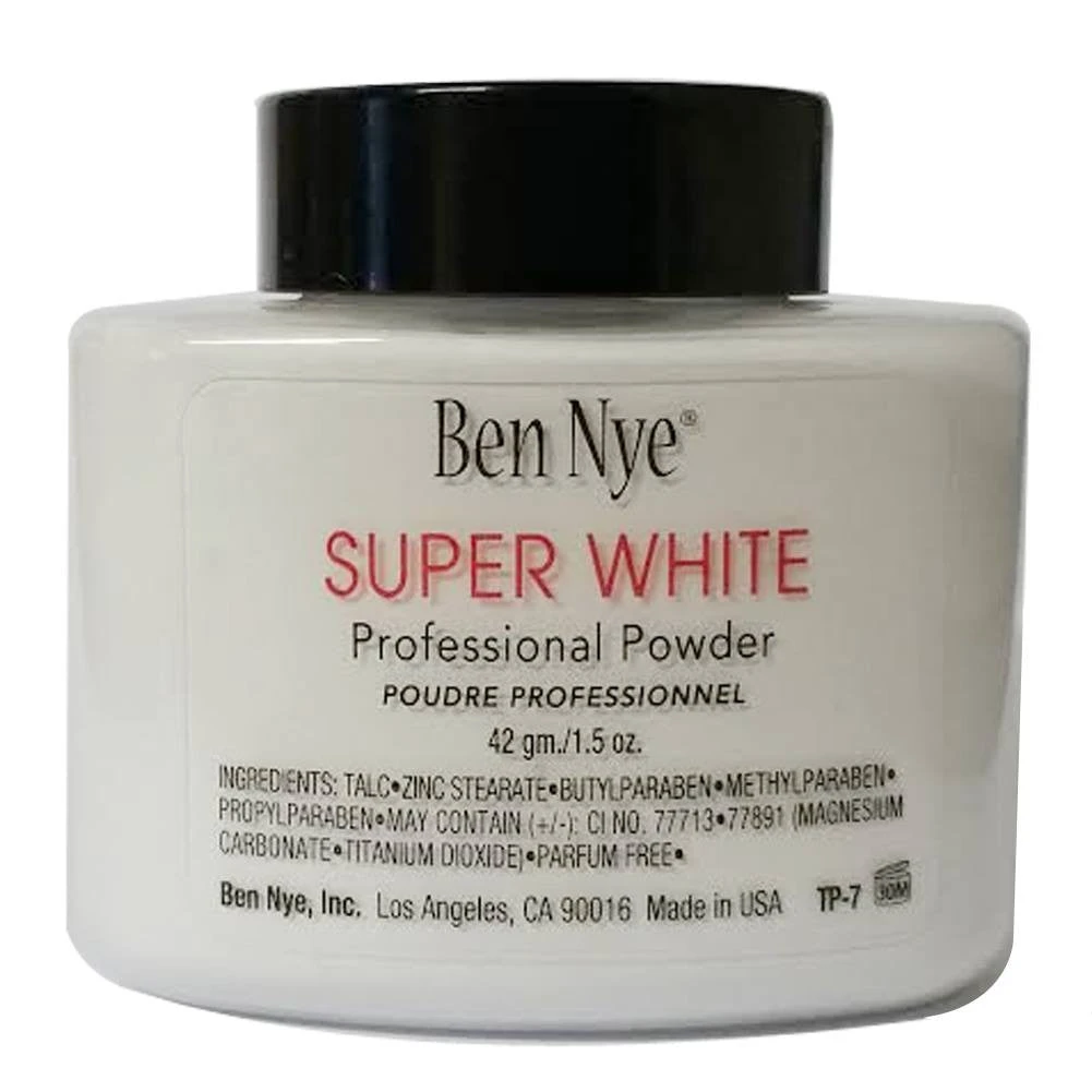 Ben Nye Super White Makeup Setting Powder is blended with white pigments and can be used to set grease or cream makeup with extra white coverage. Super White Powder sets grease and cream makeup to a sweat-proof, water-resistant finish, and even helps control perspiration. Remove makeup set with Ben Nye Setting Powder with Ben Nye Quick Cleanse Makeup Remover. Available in 3 sizes.