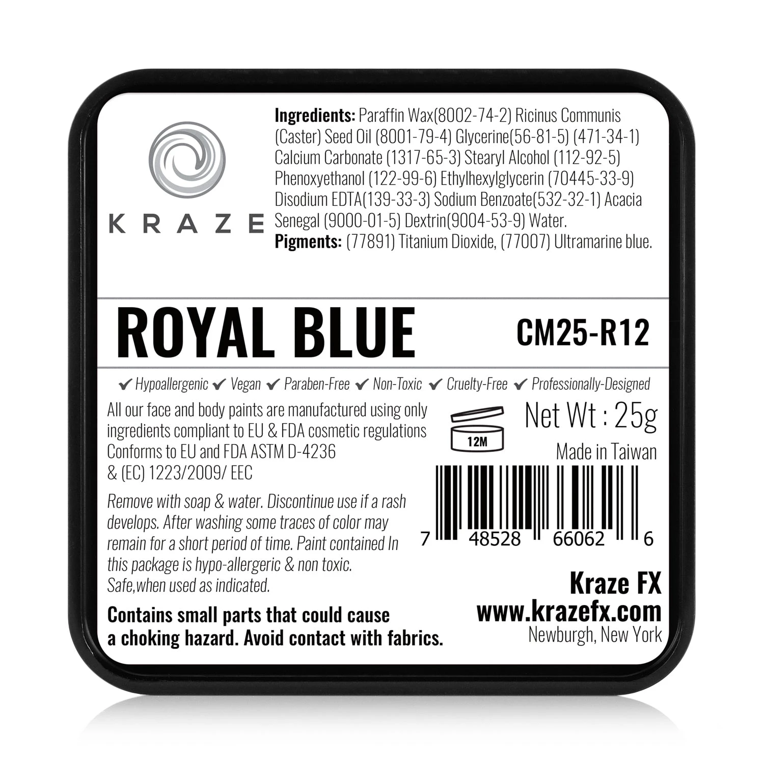 Kraze FX Royal Blue Face Paint is a wax-based formula with high pigmentation, that works best for line work. Quick drying formula is equally good for blending, base work or layering. Wax based formula offers a smooth, solid coverage that will flex with skin movements to last all day without fading or cracking. Kraze Royal Blue Face Paint comes in a 25 gm square container.