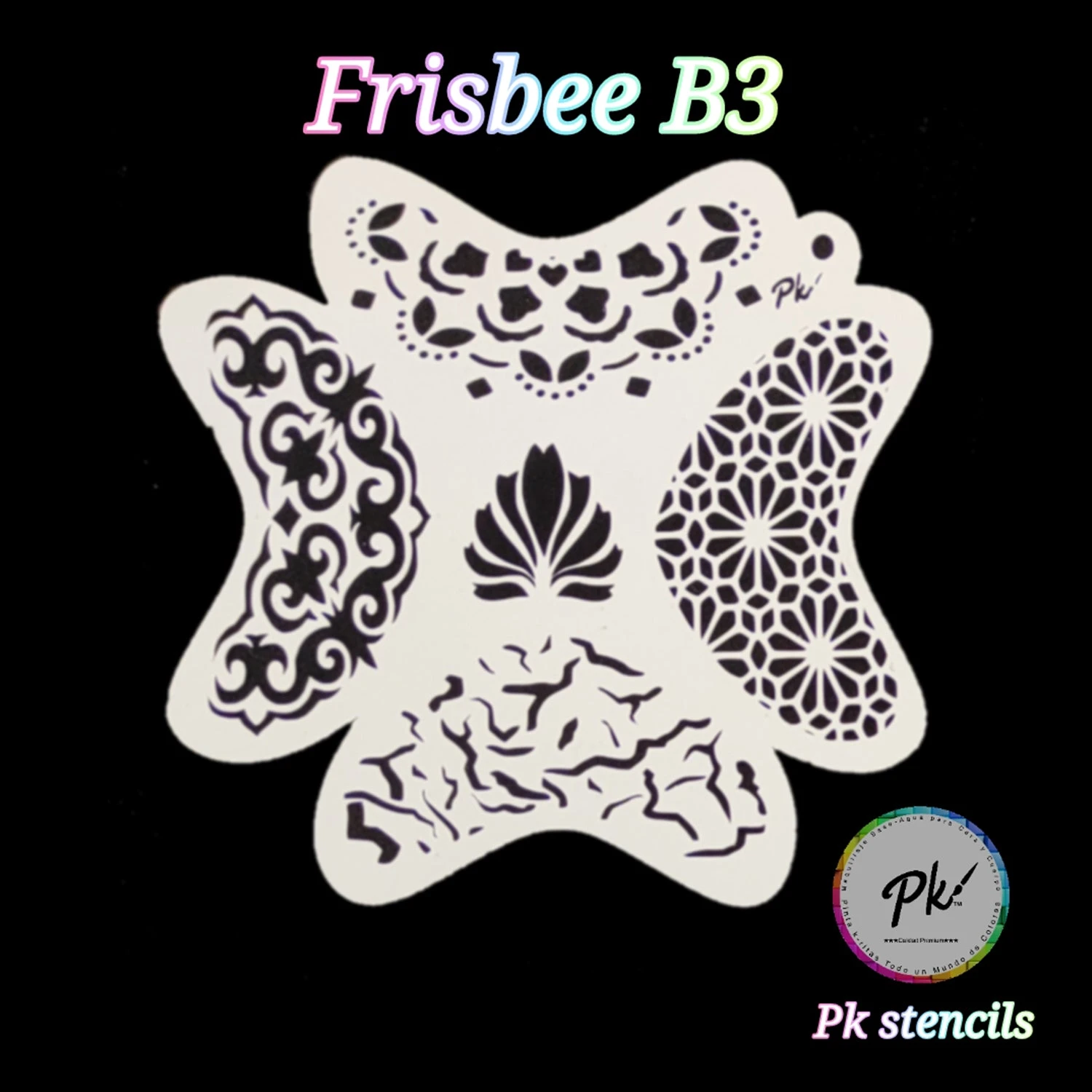 PK Frisbee Stencils can be used to paint over a face paint base or over bare skin. Hold the stencil firmly on skin and apply face paint either by using a sponge, dauber or airbrush. If you are using a sponge, make sure that it is slightly damp. Hold the stencil firmly against the skin and pat your sponge gently to evade paint from going under the stencil. Design elements can also be made by dabbing powder makeup over the stencil design. Mix and match different elements in the stencils to create beautiful unique accents.