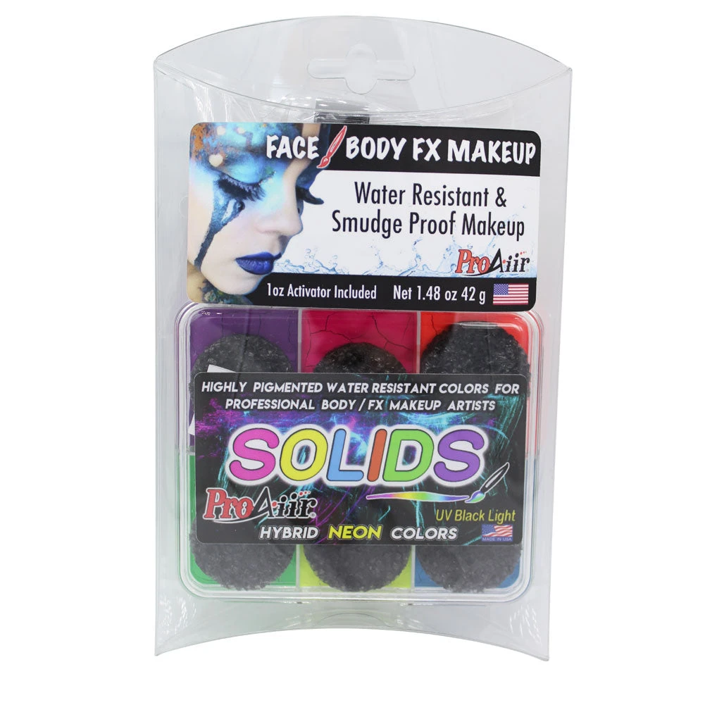 ProAiir Solids Waterproof Makeup by ShowOffs Body Art is a hybrid, solid cake with a highly pigmented and extremely durable formula, perfect for FX applications. ProAiir Solids are made using a fast drying formula that gives a pleasant smelling, waterproof and smudge proof finish. ProAiir Solids Makeup Designs will last for days and can be removed otherwise using oil based makeup removers, alcohol or liquid soap with some scrubbing.