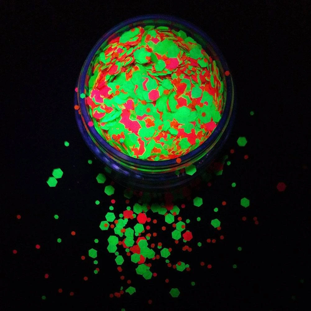 Ignite is a mix of large-cut glitters of different shapes and sizes in bright neon green, yellow, pink and orange. Neon glitter particles will create special effects with their fluorescent glow under UV light. Made of only polyester glitter without any aluminum, this colorful mix can be used for sparkling up your body art. Can be used on face, hair and nails. Also available in creamy base for easier application.